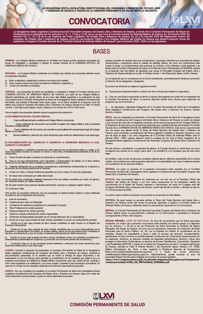 La Sexagésima Sexta Legislatura del Honorable Congreso del Estado Libre y Soberano de Oaxaca, a través de la Comisión Permanente de Salud emite la siguiente convocatoria pública a los Colegios Médicos del Estado del Oaxaca que deseen proponer ternas de aspirantes a integrar el Consejo General de la "Comisión Estatal de Arbitraje Médico de Oaxaca", para el periodo 2025-2029.